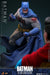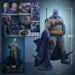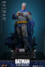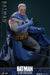 El Batitraje gris, desgastado por la batalla, está finamente confeccionado en tela elástica, con desgarros realistas y aplicaciones de pintura con sangre. Una capa azul desgastada y con alambre fluye detrás de él, mientras que el cinturón de herramientas, los guantes y las botas presentan aplicaciones de pintura con sangre. La figura también incluye una capucha sin máscara que se puede unir al cuerpo con la cabeza esculpida de Bruce Wayne, lo que permite replicar el aspecto sin la capucha para una exhibición alternativa. Armado para la guerra, Batman viene equipado con cuatro batarangs, un batarang con cuerda y un rifle. La figura se completa con una base de exhibición especialmente diseñada.