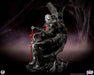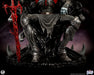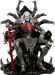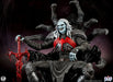 Esta estatua, completamente esculpida, mide unos impresionantes 84 cm de altura y representa a la deidad interestelar sentado con seguridad en su trono, con su vigorosa espada simbionte roja a su lado. Knull viste una armadura oscura con una vibrante araña roja en el pectoral. Sus brazos y piernas están envueltos en correas de tela deshilachadas, esculpidas con asombroso detalle. Su trono posee la textura suave y cristalina del simbionte en estado líquido. De su monstruoso asiento sobresalen enormes patas de araña de aspecto antiguo que casi abrazan al Rey de Negro.