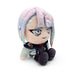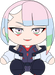 Mide 23 cm, luce una fina sonrisa rosa y maquillaje angular alrededor de sus intensos ojos pastel. Un flequillo pálido le cubre la mitad de la frente y un flequillo de colores irregulares le cae a ambos lados. Luce una chaqueta blanca con cuello negro sobre los hombros y un leotardo de netrunner azul oscuro y rojo, mientras que sus pies llevan botas estampadas. Este peluche está relleno hasta las costuras con 100 % algodón PP y está hecho de materiales minky normales y sublimados con detalles de fieltro.
