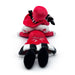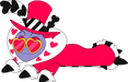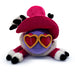 Con 40 cm de largo y un peso aproximado de 1 kg, unas gafas de sol en forma de corazón cubren sus profundos ojos rojos mientras una sonrisa juguetona cruza su rostro morado, y un sombrero de copa rojo alto con rayas negras en la base y largas plumas en forma de corazón descansa sobre su cabeza.